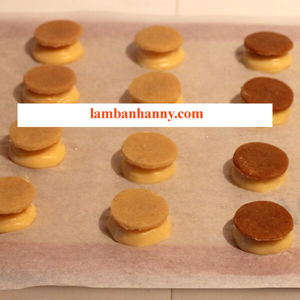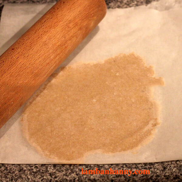 – Bước 5: Tiếp theo, cán bột vừa trộn thành miếng mỏng 1mm. Có thể đặt miếng bột giữa hai tờ giấy nến rồi cán như trong hình. Để bột vào tủ lạnh khoảng 15 phút cho bột cứng lại.