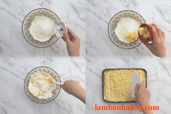 – Bước 1: Trộn hỗn hợp bột. Đầu tiên, bạn thêm 140g bột mì, 10g đường, 1g muối vào tô, trộn đều. Sau đó cắt 100g bơ lạnh thành các miếng vuông nhỏ. Trộn đều bơ và bột.