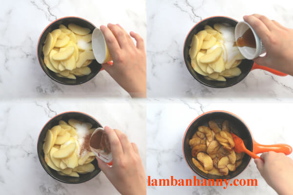 – Bước 4: Sên nhân táo, bạn cho phần táo đã cắt miếng và nồi hoặc vào chảo. Thêm vào nồi 15g đường, 1g bột quế và 15g mật ong. Đun nhỏ lửa đế khi táo mềm nhưng không bị nhũn và có màu caramel (trong lúc sên nhân không cần cho nước và luôn giữ ở lửa nhỏ)