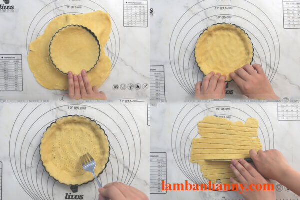 – Bước 6: Dùng tay miết bột để bột dàn đều, cần miết cả bột theo thành khuôn. Sau đó, dùng nĩa xăm nhẹ lên mặt bánh. Dùng tay miết bột để bột dàn đều, cần miết bột theo thành khuôn. Sau đó, dùng nĩa xăm nhẹ lên mặt bánh. Phần bột thừa cắt thành sợi.
