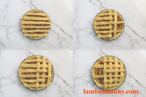 – Bước 7: Xếp phần nhân táo sên lên mặt bánh. Dùng phần bột đã cắt sợi xếp lê mặt bánh và đan vào nhau.