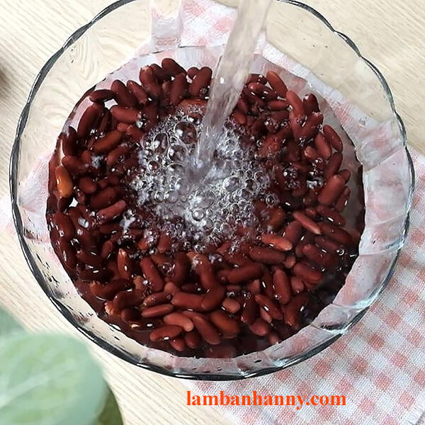 – Bước 1: Đầu tiên, bạn rửa sạch 200gr với nước rồi loại bỏ những hạt bị lép, hỏng. Tiếp theo, bạn ngâm đậu với nước lạnh trong khoảng 8 tiếng cho nở mềm ra. Đối với những hạt đậu đỏ to, bạn có thể ngâm qua đêm.