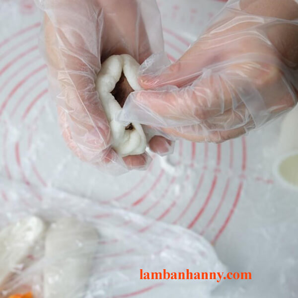 – Bước 16: Tiếp theo, bạn đặt phần nhân đậu đỏ vào giữa phần vỏ, ép chặt các mép vỏ bột vào nhau sao cho bọc kín hết nhân rồi xoay bánh 2 – 3 vòng và vo tròn.