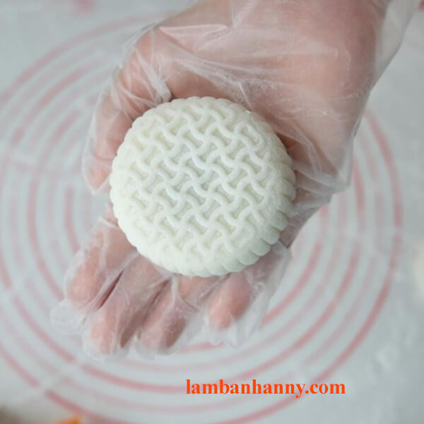 – Bước 15: Bạn lấy một phần vỏ bánh vừa chia, dùng tay nặn thành hình tròn rồi dàn đều sao cho phần bột ở rìa mép mỏng hơn phần ở giữa. Như vậy khi bọc nhân bánh, phần bột sẽ dàn đều và bám vào nhân tốt nhất.