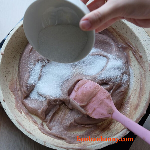 – Bước 5: Bạn bắc chảo đậu vừa xay lên bếp, vặn lửa nhỏ. Khi đậu vẫn còn lỏng, bạn thêm 80gr đường vào, rồi dùng phới trộn khuấy đều cho đến khi đường tan hoàn toàn vào đậu.