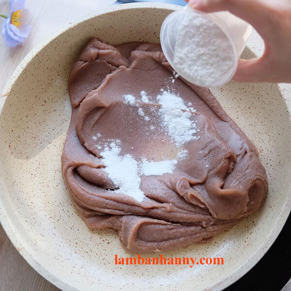 – Bước 8: Đợi khoảng vài phút, bạn cho tiếp 10gr bột bánh dẻo vào sau cùng, rồi sên tiếp tới khi nhân kết thành một khối dẻo mịn, không bị chảy, không bị dính chảo thì tắt bếp.