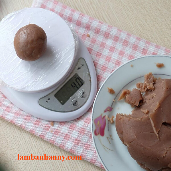 – Bước 9: Với phần nhân đậu đã sên xong, bạn để nguội bớt, khi vẫn còn hơi ấm thì nặn nhân thành các viên tròn 40gr, sau đó bọc nhân lại để tránh bị khô khi làm vỏ bánh.