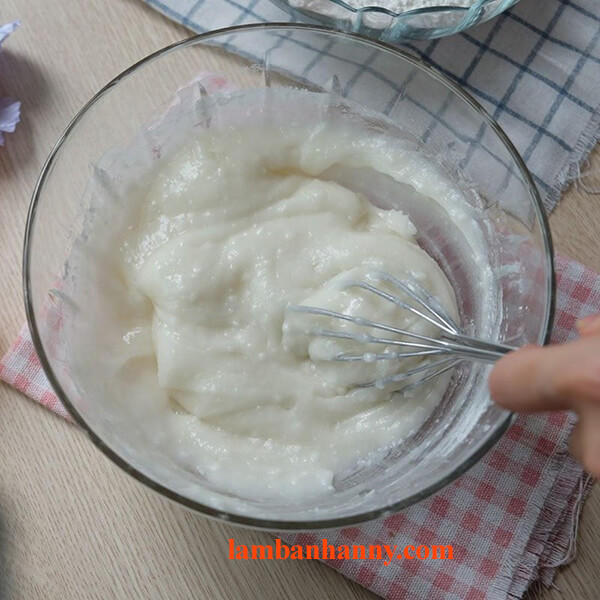 – Bước 11: Bạn cân đủ 200gr bột bánh dẻo, cho vào 1 tô lớn. Tiếp theo, bạn dùng một tay múc từng muỗng bột bánh dẻo cho vào nước đường, tay còn lại dùng phới lồng khuấy đều bột với hỗn hợp nước đường. Hãy làm thật nhanh tay để bột không bị lợn cợn. Cứ thêm bột từ từ cho tới khi hỗn hợp bột đặc lại.