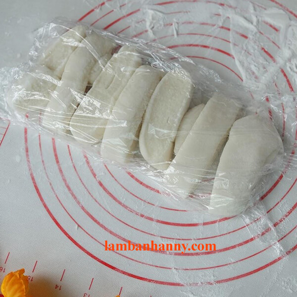 – Bước 14: Cuối cùng, bạn chia khối bột thành các phần bằng nhau có khối lượng 70gr. Với phần bột bạn chưa dùng tới hãy bảo quản trong màng bọc thực phẩm để bột không bị khô.