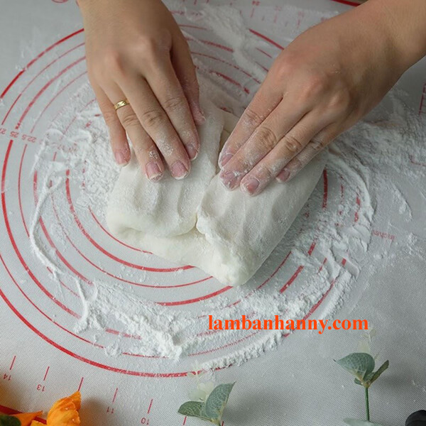– Bước 12: Khi đổ xong phần bột, bạn dùng tay nhào thật nhanh để tạo thành khối bột. Tiếp đó, bạn cho khối bột ra tấm nhào rồi xoa 1 lớp mỏng bột khô.